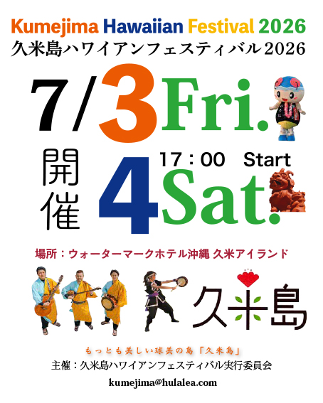 【久米島ハワイアンフェスティバル2026】の詳細はこちらです。 2026年7月3日(金)、4日(土)【久米島ハワイアンフェスティバル2026】の詳細はこちらです。お申し込みはリンク先申込書PDFにご記入し、以下メール宛にてお送りください。 kumejima@hulalea.com 2025/12/26
