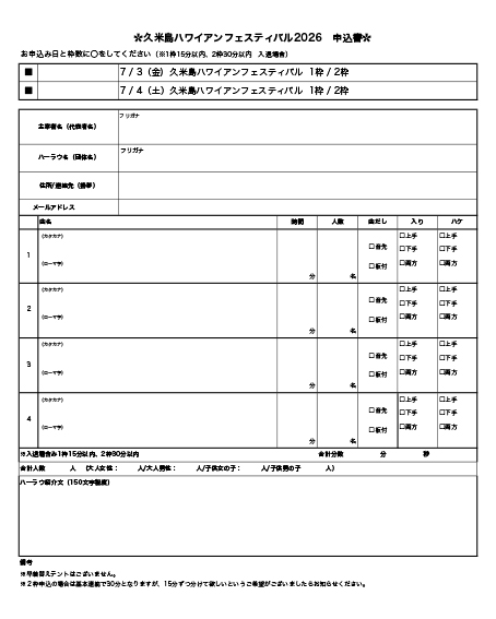 【久米島ハワイアンフェスティバル2026】のお申し込みはエクセルでも大丈夫です。 2026年7月3日(金)、4日(土)開催【久米島ハワイアンフェスティバル2026】のお申し込みはエクセルでも大丈夫です。ダウンロードはこちらから。同じく以下メール宛にお送りください。 kumejima@hulalea.com 2025/12/27